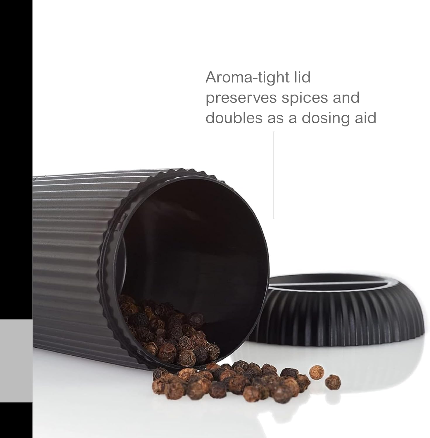 Practical and stylish, this salt and pepper mill set is built with a top-mounted grinder to avoid crumbs on the table. The aroma-tight lid keeps spices fresh, and the screw lock makes refilling quick and effortless.