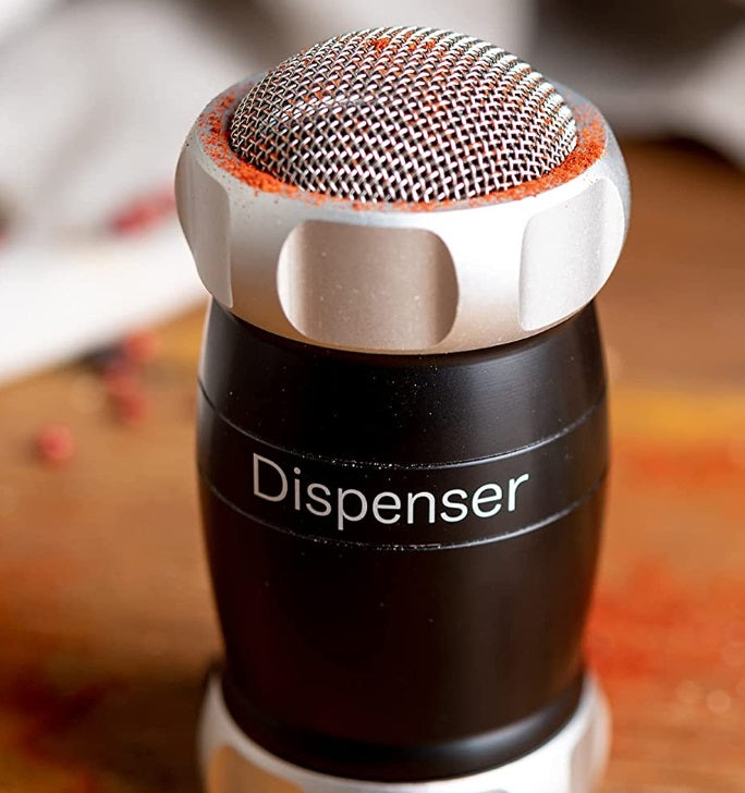 This dispenser from Marcato of Italy allows you to easily sift powdered or caster sugar, flour, or cocoa onto baked goods. The black dispenser is made from anodized aluminum, ideal for food processing. The super sturdy construction provides perfect durability. The dispenser is made in Italy.
