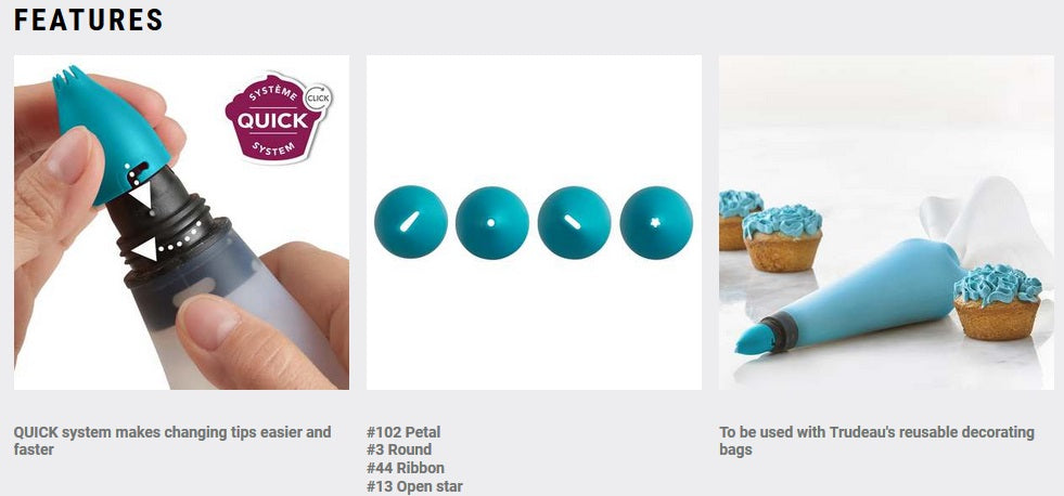 The Trudeau Ruffles and Writing Decorating Tips allow you to create the most beautiful writing and ruffles! The tips feature a system that lets you change the tips easier and faster than ever. The plastic tips easily click to the integrated coupler of your decorating bags.