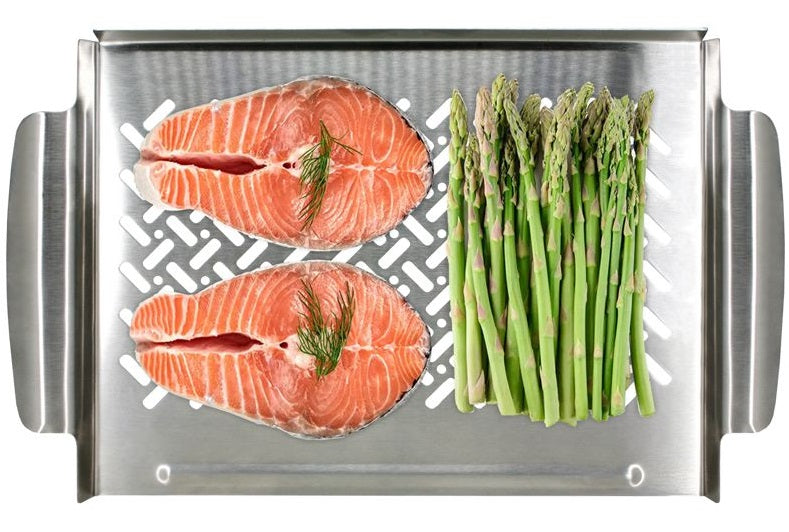 This grill topper features raised rims, which not only help contain the food securely but also make it easier to lift and maneuver on the grill. The shallow design of the topper is another thoughtful feature, facilitating easy flipping of delicate items like seafood fillets or thinly sliced vegetables, thus ensuring they cook properly on both sides.