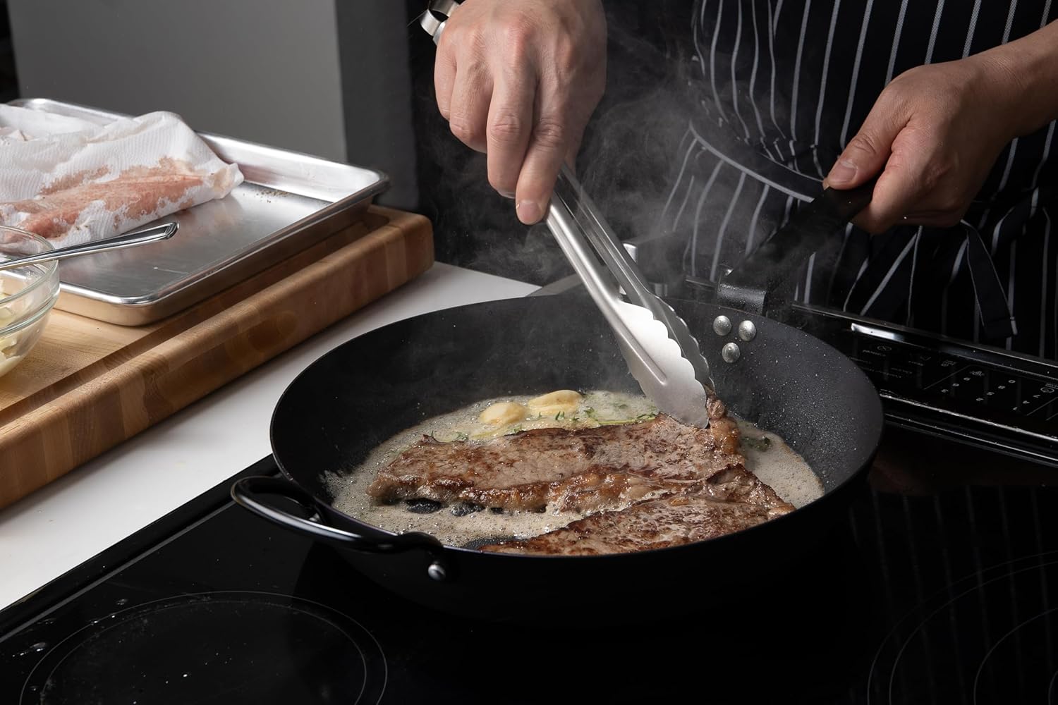 With a smart locking system, these tongs open and close with one hand. Great for flipping, turning, or serving without the mess.
