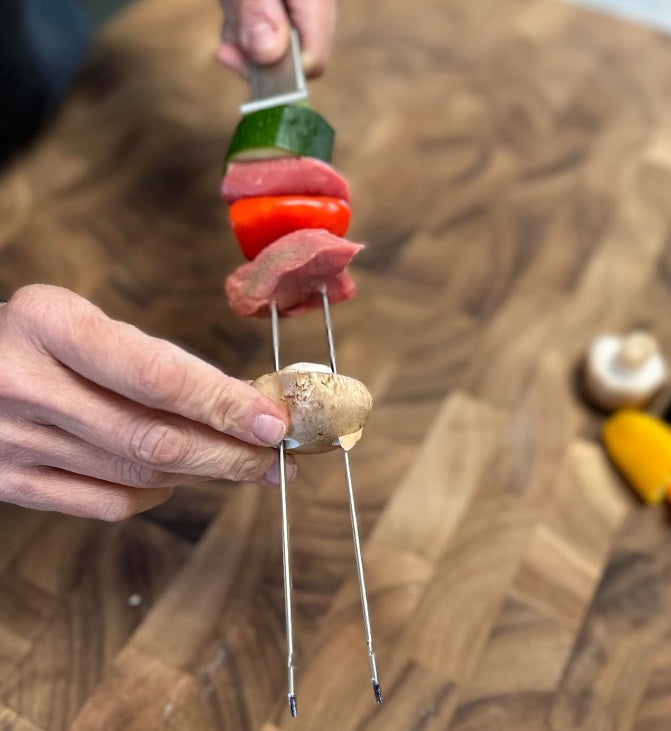 Each skewer features a handy slider that allows you to effortlessly remove veggies, seafood, or meat from the skewer without any hassle. The double-pronged construction ensures your food stays securely in place while turning, providing even grilling every time.