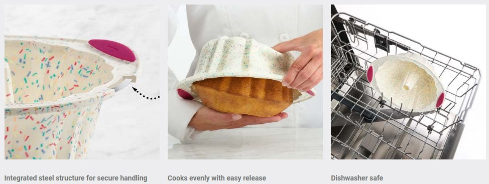 The Trudeau Silicone Fluted Cake Pan will help you to make impressive cakes for your family and friends. Made with fluted sides and a tube in the center, it is ideal for baking angel food and chiffon cakes. This fluted cake pan has a confetti pattern that will add some fun and a touch of color to your kitchen.