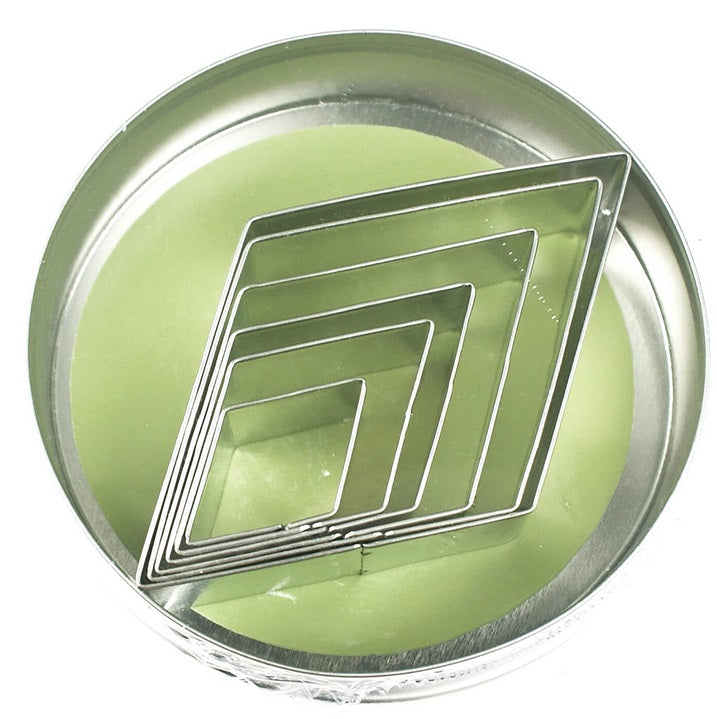 The diamond cookie cutters are made from durable stainless steel and are built to last. The diamond shaped cookie cutters can also be used for fondants, crafts, and more. The set includes 6 diamond cutters, measuring from 2 inches up to 4 inches.