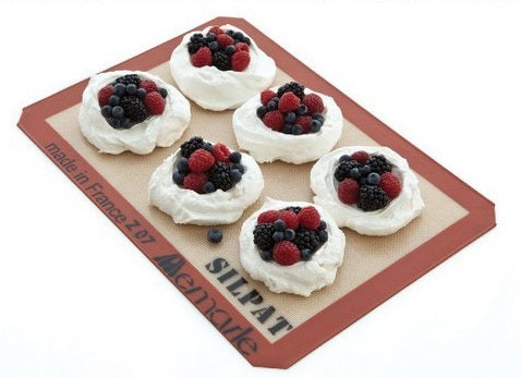 The Silpat silicone baking mat is a must have for any chef or home baker. The toaster-size non stick baking mat is made from silicone and fiberglass and is perfect for baking cookies, patisseries, and more. You can place the Silpat baking mat on any surface when working with sticky foods like batter, caramel, taffy, etc. It will not stick and prevents a mess. The Silpat baking mat does not need to be greased, measures 10.875 x 7.875 inches / 27.6 x 20 cm, and is made in France.