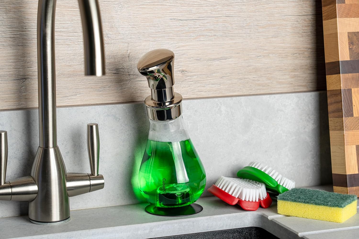 With a shiny silver finish and suction base, this foam soap pump stays in place and looks great on your counter. Use it for hand or dish soap with ease.