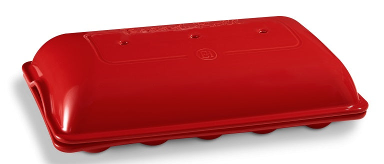 This burgundy red (grand cru) colored baker is also microwave, freezer and dishwasher safe. Made in France, this mini-baguette baker is a product of Emile Henry. It comes with a 10-year guarantee. The baguette baker measures 39 x 23 x 11 cm.