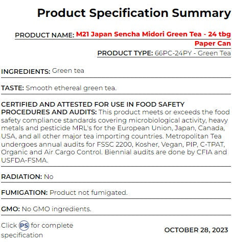 Eco-Friendly Packaging: At The Metropolitan Tea Company, we're committed to sustainability. That's why our Sencha Midori Green Tea is packaged in an environmentally friendly, plastic-free paper can. Each can contains 24 pyramid tea bags, making your tea experience both serene and eco-conscious.