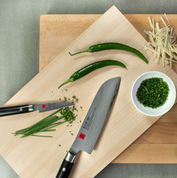 The Kasumi Damascus Santoku Knife is made for quick, easy prep. It handles slicing, dicing, and chopping with comfort and precision.