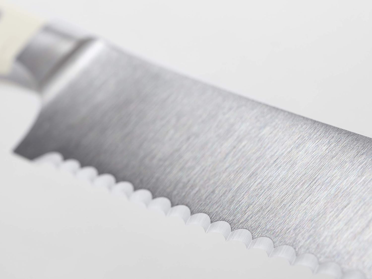Set includes: 3.5" paring, 5" serrated utility, 6" utility, 8" cook’s, 7" Santoku (hollow ground), 9" bread knife, crème ash wood block