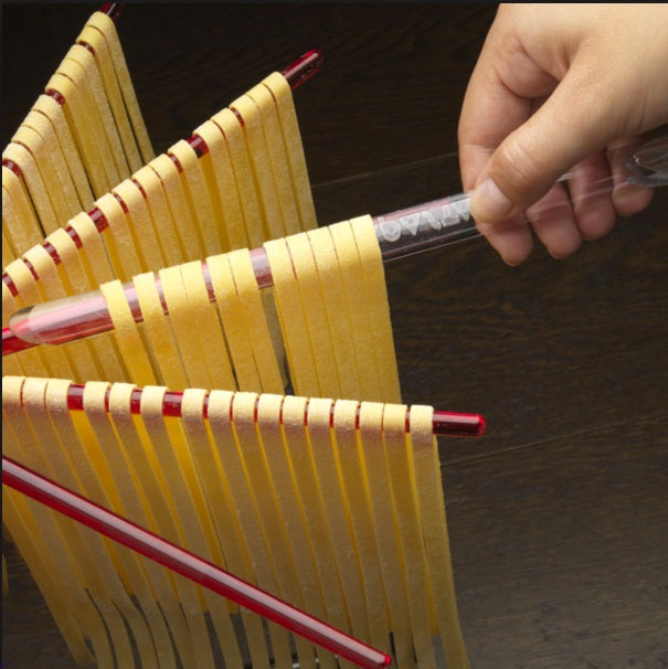 This high quality red pasta drying rack from Marcato is made in Italy from polycarbonate and chrome plated steel for both stability and durability. The rack features 16 8" arms that fan out, allowing you to easily dry your homemade pasta. The red pasta drying rack folds for convenient storage and has a 10 year warranty.