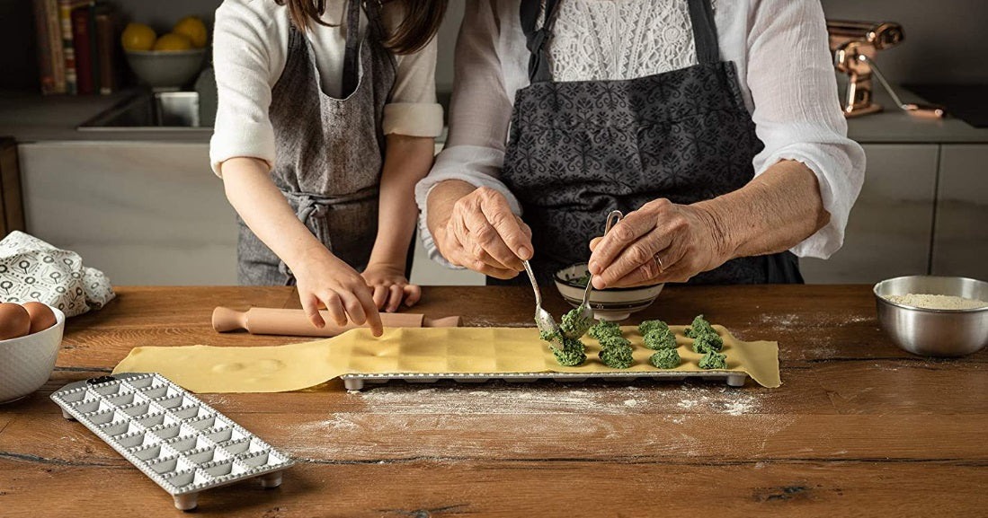 Great for large families, you can make a couple of dozen portions of ravioli all at once. It makes a traditional, 1” / 25mm square ravioli with fluted edges. Easy to clean and maintain, this aluminum ravioli maker mold should be hand-washed in soapy water. The ravioli maker set is made in Italy and comes with a rolling pin included.