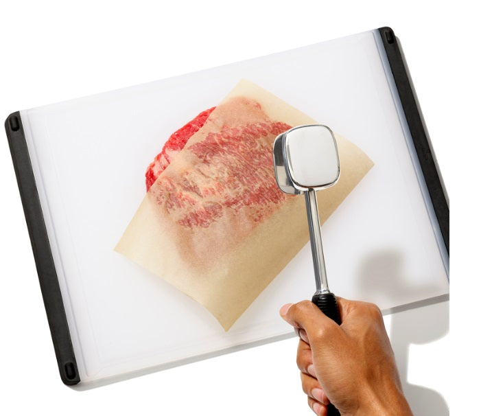 Made of cast steel, this meat tenderizer is sturdy and strong. It is designed with a flat side for pounding and a textured side for tenderizing. The Oxo meat tenderizer measures 24.5 cm / 9.5 inches.