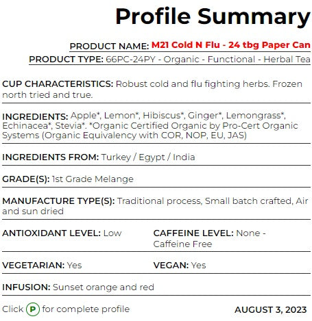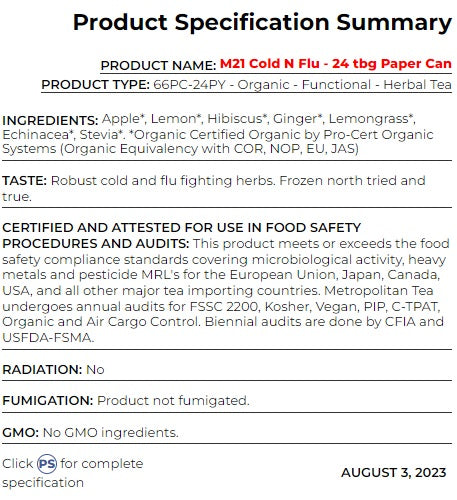 The Metropolitan Tea Company Organic Cold & Flu Tea comes in a beautiful paper can that includes 24 luxury pyramid teabags. The tea features robust cold and flu fighting herbs. Frozen north tried and true.