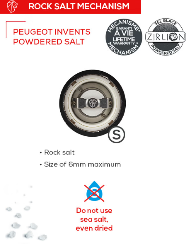 Suitable for peppercorns up to 6 mm and dry salt up to 4 mm