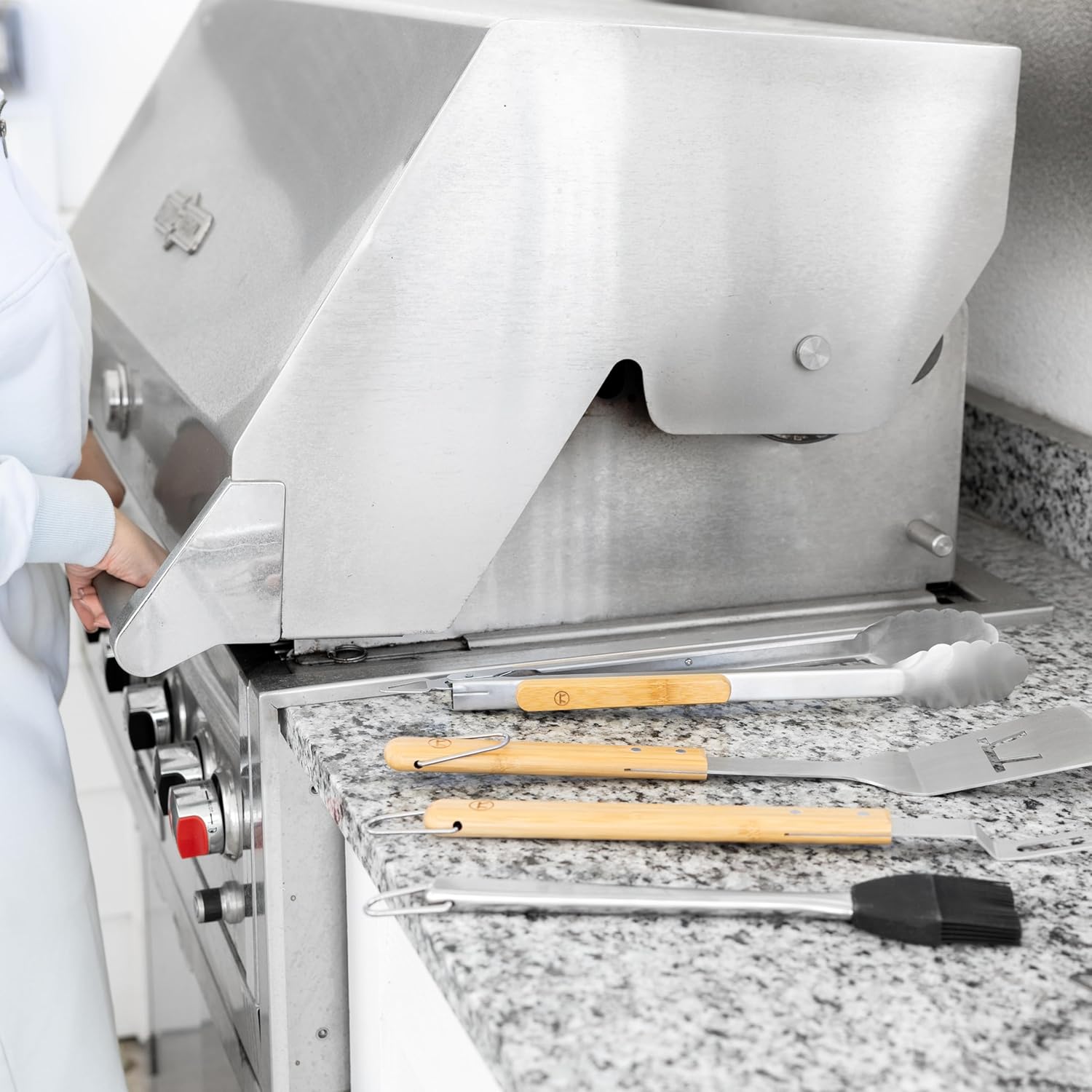 The Outset Grill Tool Set gives you everything you need for effortless outdoor cooking. This 4-piece set includes a spatula, tongs, grilling fork, and sauce brush — all crafted from durable stainless steel for long-lasting performance. The ergonomic bamboo handles provide a comfortable grip and a natural, stylish touch.