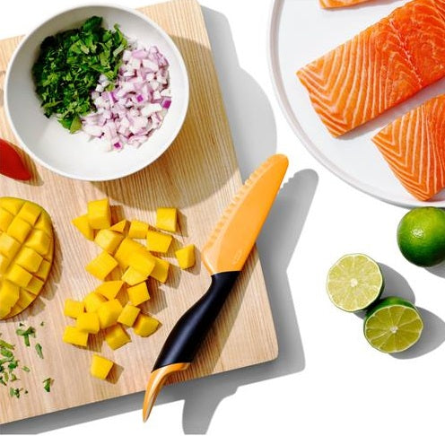 The Oxo Mango Slicer lets you easily enjoy the soft and juicy taste of mango fruit. It will slice, scoop, score, and peel any size mango really fast. Mangos can be very slippery. However, this mango slicer has a nonslip handle that provides a secure grip.