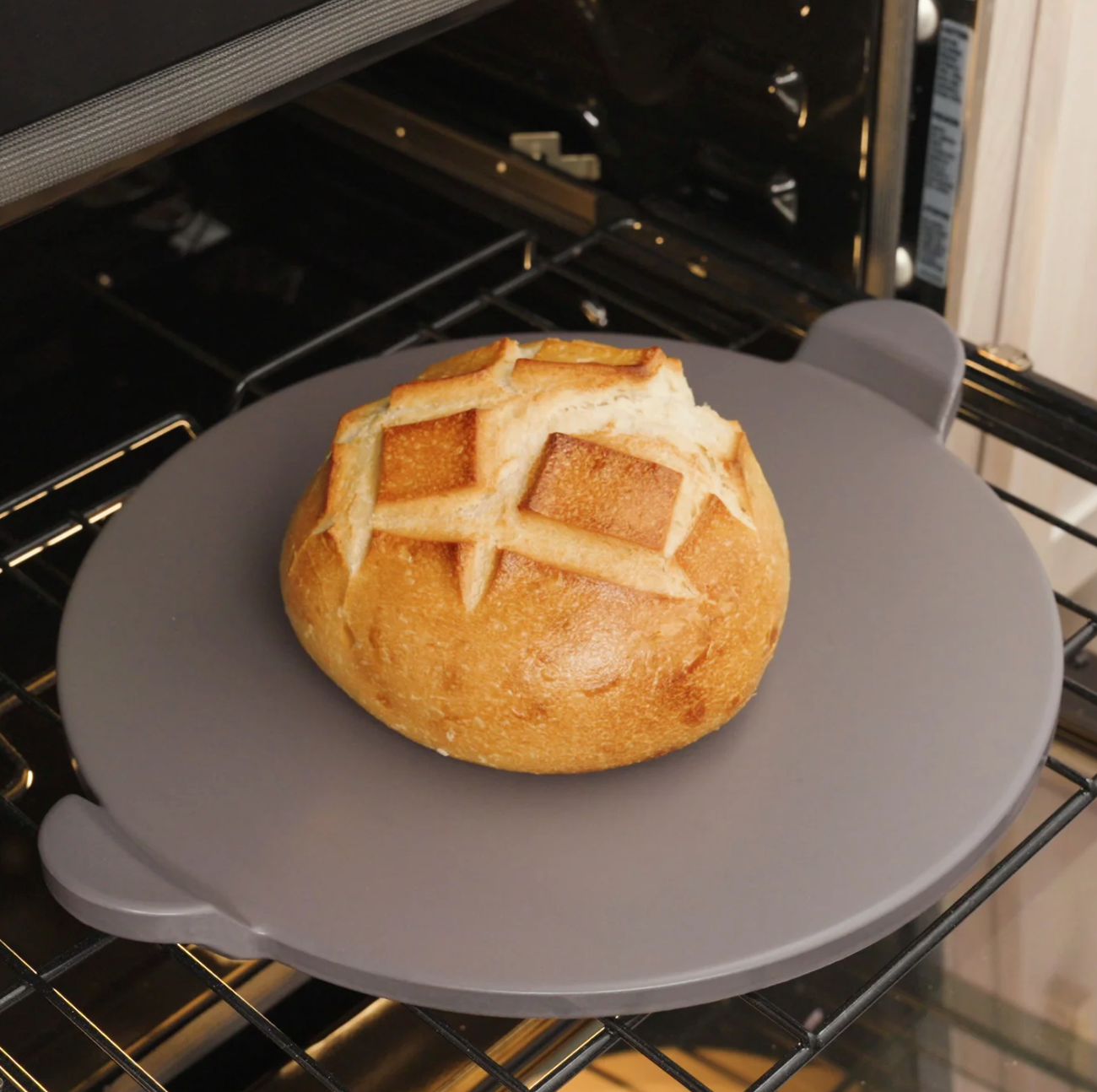 The durable baking stone is crafted from high-heat cordierite and built to last. The grey glazed surface resists oil and fat, while the built-in handles make it easy to move from oven to table.