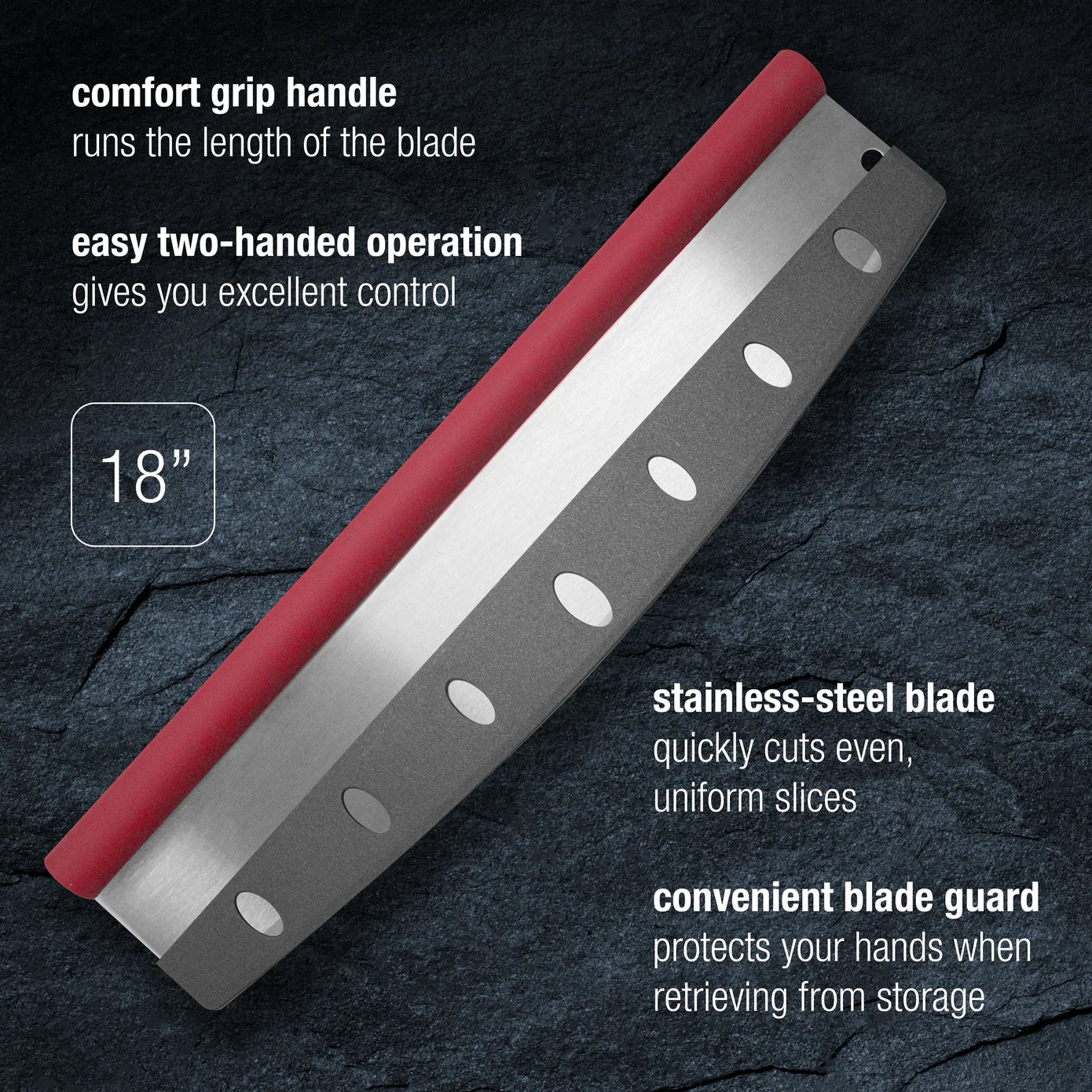 • Cuts through thin and thick crust pizzas with ease