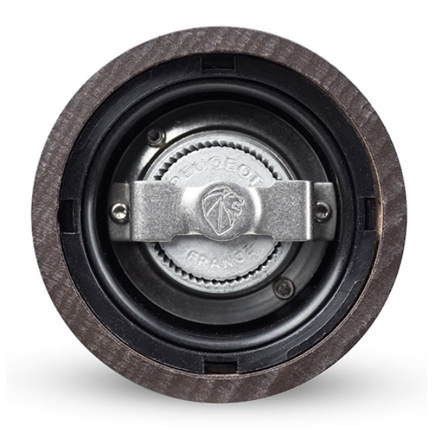 The eye-popping Auberge pepper mill from Peugeot features the patented u'Select system, allowing you to easily adjust the grind setting to any point between powdery fine and very coarse. Peugeot removed the center shaft of this mill and the reservoir stopper is magnetized to provide the benefit of greater peppercorn capacity and easier refilling. The chocolate colored Auberge pepper mill has a lifetime warranty, stands 27 cm / 10.75 inches tall, and is made in France.