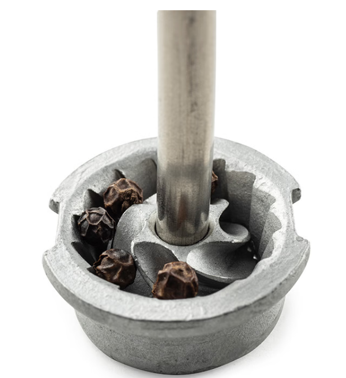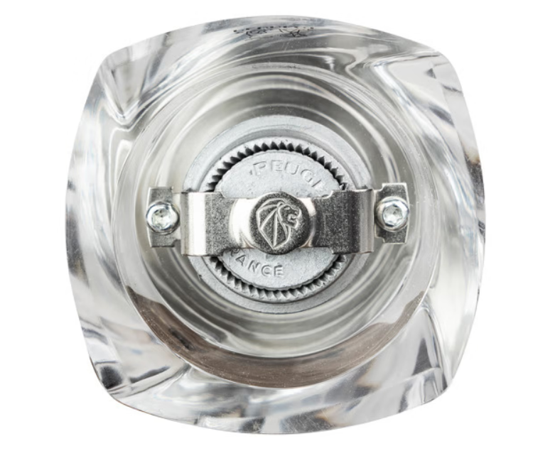 The beautifully designed Molene pepper mill from Peugeot has an acrylic translucent body with a black top. The grinder features a fully adjustable 2-stage pepper grinding mechanism that first cracks and then grinds peppercorns for the best possible flavor experience. The grinding mechanism is made from hardened carbon steel and its patented coating prevents from corrosion. The pepper mill has a stainless steel top nut that can be tightened and loosened for either more coarse or finer grinds. The pepper mill has a lifetime warranty, stands 14cm / 5.5 inches tall, and was made in France.