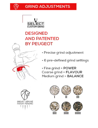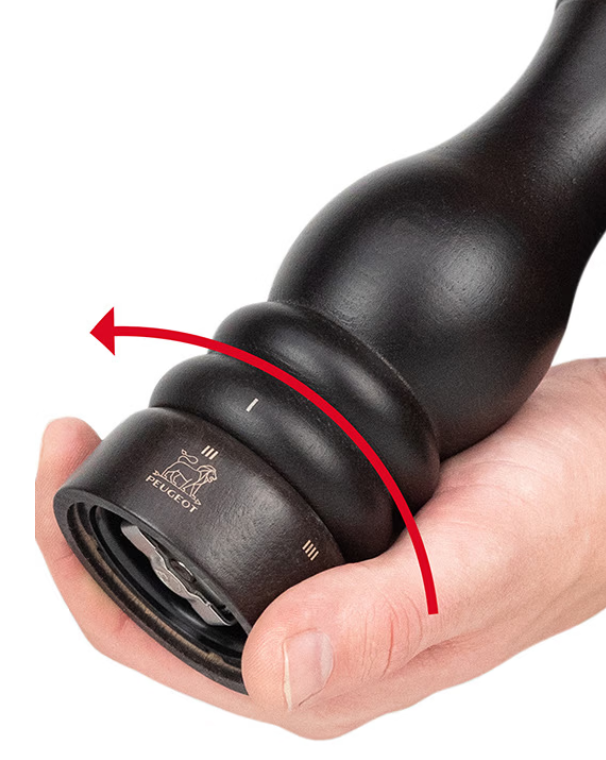 The Paris pepper mill from Peugeot features a beautiful chocolate-brown finish and stands 30cm / 12 inches tall. The gorgeous pepper mill comes with the patented u'Select grinding mechanism that allows you to select from 6 grind settings, from anywhere powdery fine to very coarse. To select your preferred coarseness, simply turn on the bottom part of the mill. To refill, unscrew the nut on top and add peppercorns. The Peugeot Paris pepper mill comes with peppercorns, is made in France, and has a lifetime warranty.