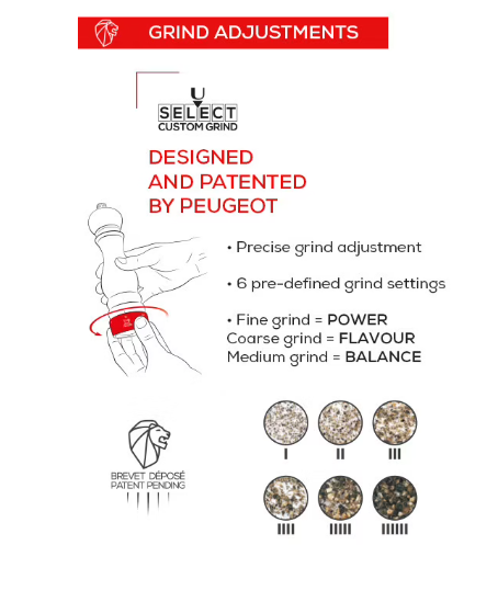 The Paris pepper mill from Peugeot features a beautiful white lacquer finish and stands 30cm / 12 inches tall. The gorgeous pepper mill comes with the patented u'Select grinding mechanism that allows you to select from 6 grind settings, from anywhere powdery fine to very coarse. To select your preferred coarseness, simply turn on the bottom part of the mill. To refill, unscrew the nut on top and add peppercorns. The Peugeot Paris pepper mill comes with peppercorns, is made in France, and has a lifetime warranty.