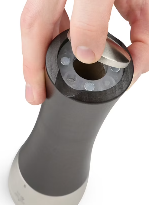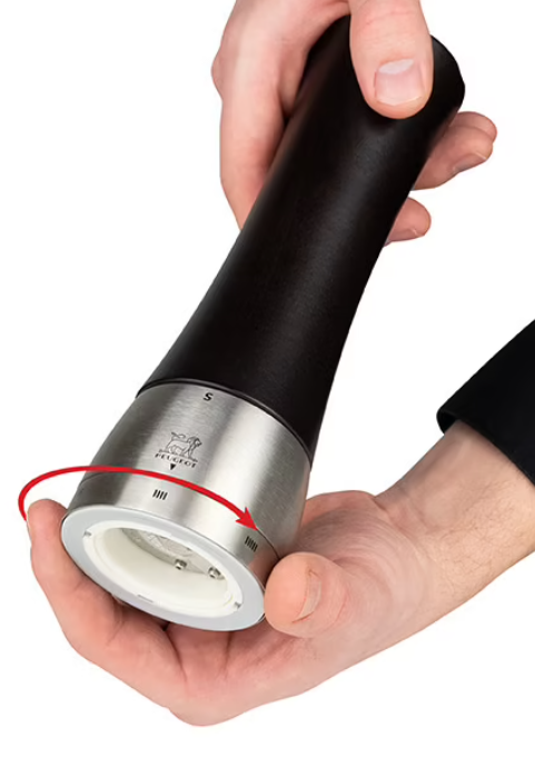 The beautifully designed Madras salt and pepper mills by Peugeot feature the patented u'Select system, allowing you to easily adjust the grind setting to any point between powdery fine and very coarse. Peugeot removed the center shaft of these mills and the reservoir stopper is magnetized to provide the benefit of greater salt or peppercorn capacity and easier refilling. The large, chocolate colored Madras salt and pepper mills have a lifetime warranty, stand 21 cm / 8.25 inches tall, and are made in France.