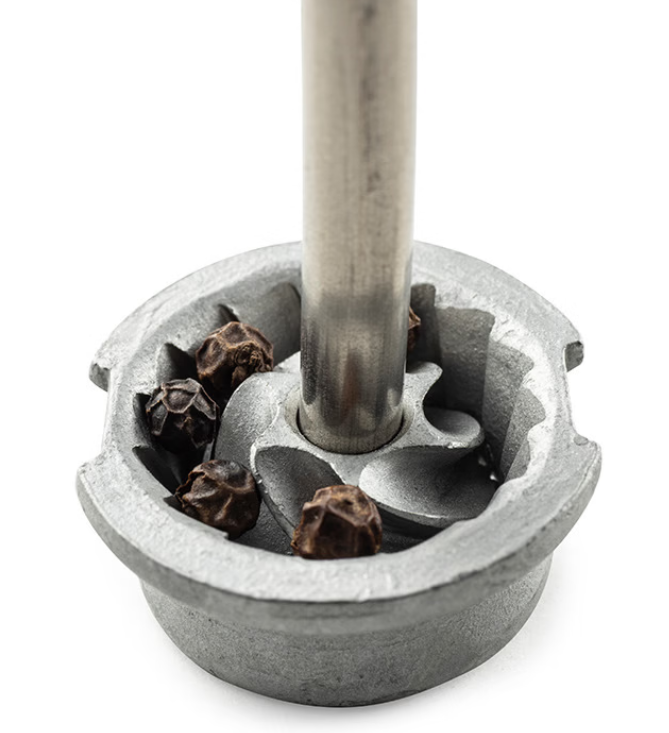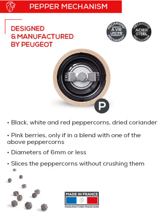 The Paris pepper mill from Peugeot features a beautiful black lacquer finish and stands 23cm / 9 inches tall. The gorgeous pepper mill comes with the patented u'Select grinding mechanism that allows you to select from 6 grind settings, from anywhere powdery fine to very coarse. To select your preferred coarseness, simply turn on the bottom part of the mill. To refill, unscrew the nut on top and add peppercorns. The Peugeot Paris pepper mill comes with peppercorns, is made in France, and has a lifetime warranty.