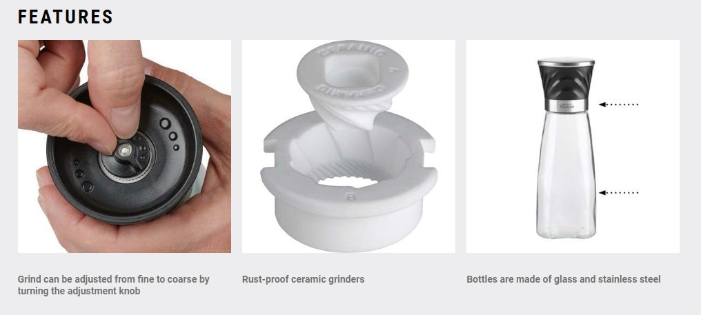 Crafted from thick glass and styled in bold black and white, this pepper mill & salt mill set not only looks great but keeps spices fresh and your counters clean.