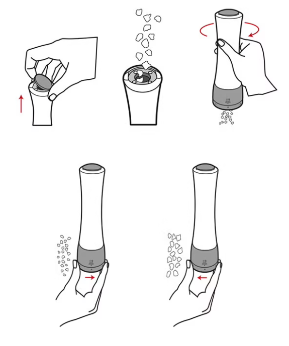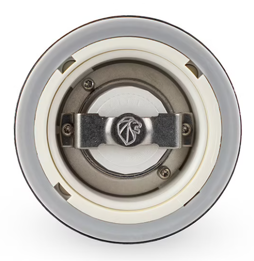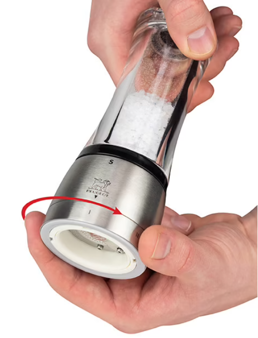 The gorgeous Daman salt mill by Peugeot features the patented u'Select system, allowing you to easily adjust the grind setting to any point between powdery fine and very coarse. Peugeot removed the center shaft of the mill and the reservoir stopper is magnetized to provide the benefit of greater salt capacity and easier re-filling. The large Daman salt mill with acrylic top and stainless steel bottom has a lifetime warranty, stands 21 cm / 8.25 inches tall, and is made in France.