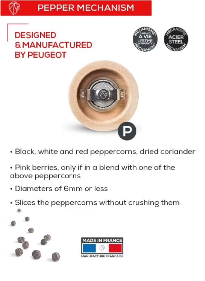 The stunning Fidji salt mill from Peugeot is made from olive wood with a silky smooth touch. The salt grinder has a brushed stainless steel top and a high quality grinding mechanism, specially designed to release maximum flavor and aroma by first cracking each sea salt rock before it is ground. You can easily adjust the coarseness of the grind by turning the top nut. The Peugeot pepper mill was made in France, stands 15cm / 6 inches tall, and has a lifetime warranty.