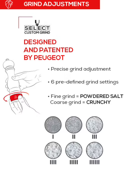 This beautifully designed Paris salt mill from Peugeot features an attractive black lacquer finish and stands 30cm / 12 inches tall. The salt mill features a specially treated stainless steel grinding mechanism that protects from corrosion and wear. The Peugeot salt mill comes with the patented u'Select grinding mechanism that allows you go select from several preset grind settings by turning the bottom part of the grinder. You will be able to grind salt from powdery fine to very coarse. The Paris salt mill is made in France and has a lifetime warranty.