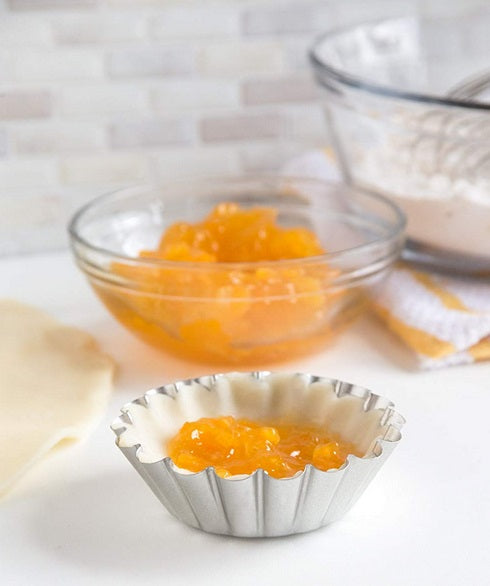 This tart tin measures 3.5 x 3.5 x 1 inches / 8.9 x 8.9 x 2.5cm and is made from durable, tin-plated steel. This tart pin is perfect for making tart shells for individual desserts or savory appetizers.