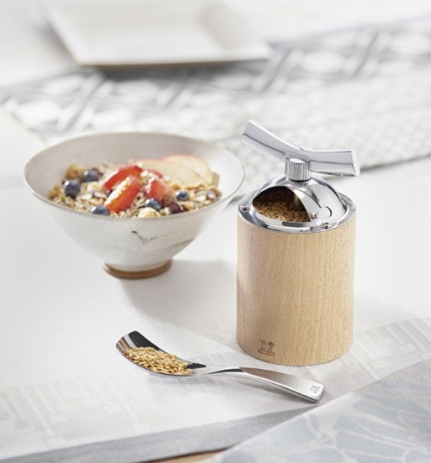 The Isen flax seed grinder from Peugeot is specifically designed to grind both flax and sesame seeds. The mechanism can easily be removed for cleaning. The flax seed mill has a striking stainless steel and French wood design and stands 13cm / 5 inches tall. The flax seed mill comes with a stainless steel measuring spoon (5g capacity) and a cleaning brush. The flax seed grinder is made in France with a lifetime warranty on its grinding mechanism.