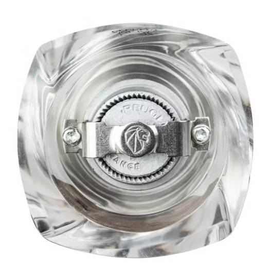The gorgeous Oleron chili mill from Peugeot of France features a stylized, translucent, curved body designed with a light twist that highlights the movement of the grinding mechanism. The top is made from chocolate colored, French beech wood. The chili grinder is equipped with a helix-shaped double row of teeth that guide and hold the chili peppers for a perfect grind, every time. To adjust the grind, simply turn the stainless steel top nut to left (for finer) or to the right (for coarser). The attractive chili mill stands 14cm / 5.5 inches tall, was made in France, and has a lifetime warranty.