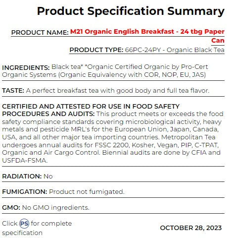 Elevate your mornings with the finest cup of tea—M21 Organic English Breakfast, a creation by The Metropolitan Tea Company. This exceptional black tea embodies the essence of a perfect breakfast tea, with robust body and full tea flavor. It's a sip that starts your day on the right note. Here's why this tea is a true ode to morning freshness: