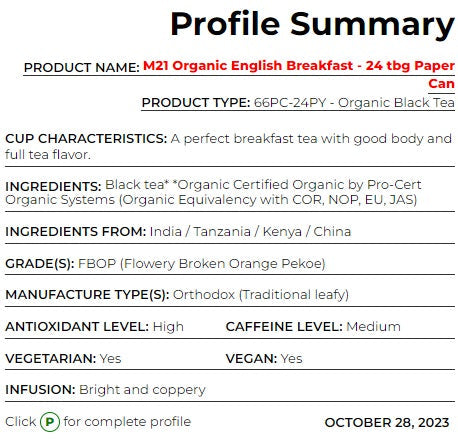 Embrace Morning Perfection: Order your M21 Organic English Breakfast today and experience the blend of hearty body and full tea flavor, all while cherishing eco-friendly packaging.