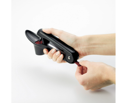 The Cuisipro Cherry Pitter offers a clean and simple way to remove pits with just one hand. Its black silicone cup has flexible fins that securely hold cherries or olives in place.