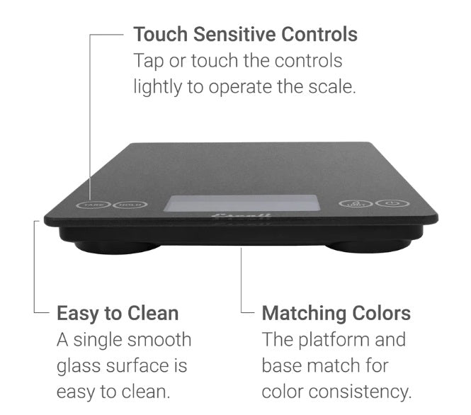 You'll appreciate the Escali Arti Digital Glass Kitchen Scale for its speed, accuracy, and elegant look. It features a modern design that includes a touch screen and a large digital display that is easy to read. It is lightweight and very attractive. Its tempered glass and red tone give it a little shimmer. Place any food item on this digital glass kitchen scale to precisely measure in weight and/or volume.
