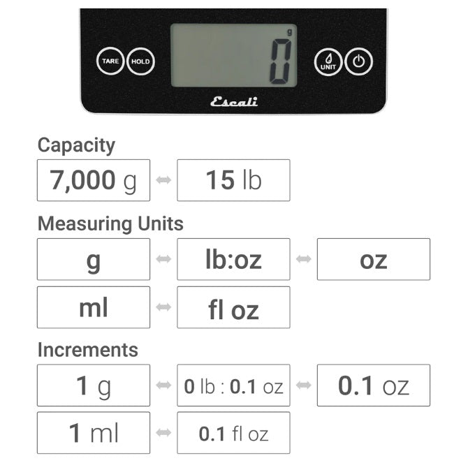 This kitchen scale has a capacity of 15lbs (7000g) and a scale increment of 0.1oz (1g). Other features include a tare button, display hold, and unit selection. It operates using two CR2032 batteries and has an automatic shutoff to protect the battery and conserve energy.