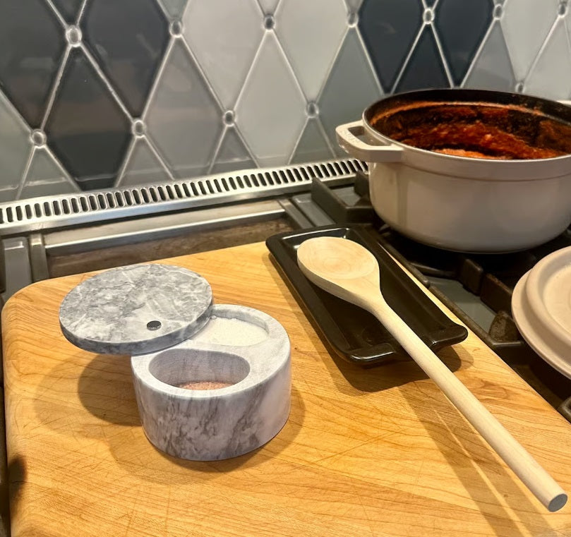 With its classic white marble, this salt storing dish adds a touch of elegance to any kitchen setting. It's the perfect accessory for when you need just a pinch of salt to elevate your dishes. Experience the feel of a professional kitchen with this essential tool!