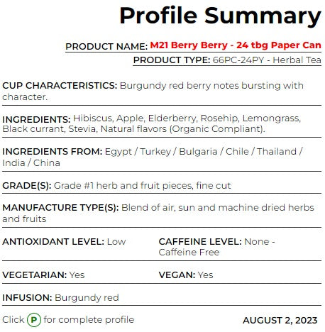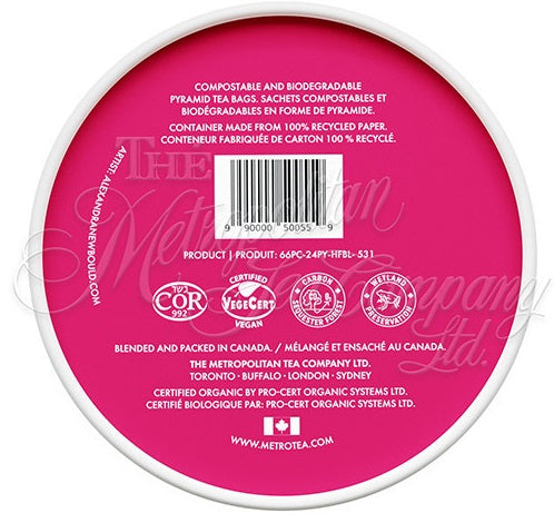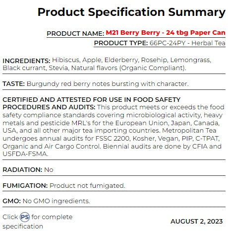 The Metropolitan Tea Company Berry Berry Tea comes in a beautiful paper can that includes 24 luxury pyramid teabags. The tea is full flavored with deep berry notes. The infused cup of tea is burgundy red an provides strength and character. The berry berry tea tastes great both hot or as an iced tea.