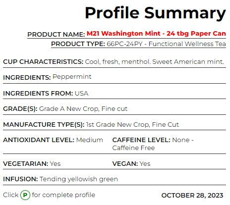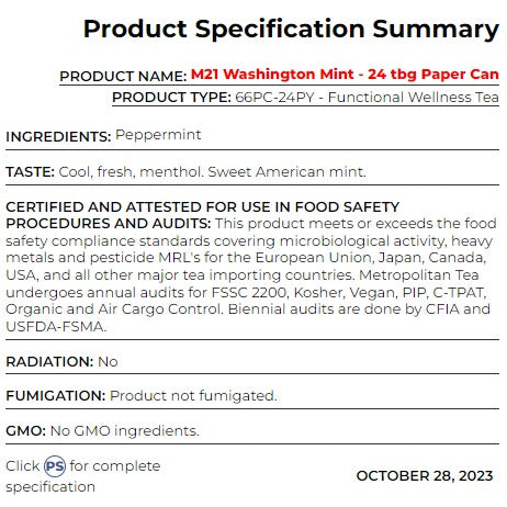 Discover the refreshing taste of M21 Washington Mint Tea, a creation by The Metropolitan Tea Company. This invigorating peppermint tea delivers a cool and fresh menthol sensation, embodying the essence of sweet American mint. It's a sip that transports you to the lush fields of Washington State. Here's why this tea is a true ode to the coolness of mint: