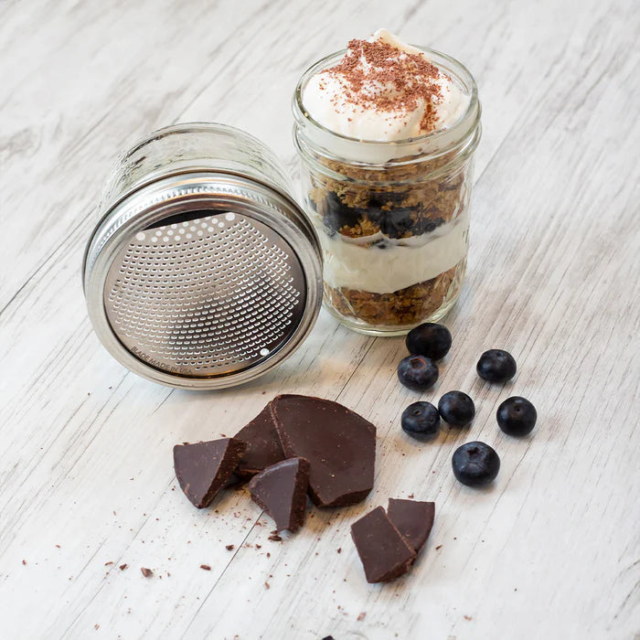 The Microplane Jar Lid Etched Grater Set is a smart, space-saving tool designed to fit wide-mouth canning jars. It comes with two USA-made, ultra-sharp stainless steel blades — one fine and one ribbon — giving you the flexibility to create a variety of textures for different recipes. Perfect for preparing on-the-go jar salads, soups, spice rubs, or vinaigrettes, it brings professional-quality grating right into your kitchen.