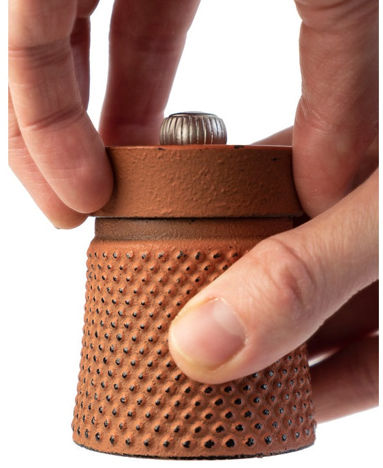 Small, but powerful, the Peugeot Bali Fonte Orange Cast Iron Pepper Mill will grind many type of pepper including Sichuan, black, pink, and green peppercorns. This manual pepper mill stands 8 cm / 3 inches in height. Its orange color with brown earth tones gives this pepper mill its natural beauty and distinctive look.