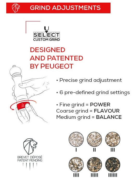 Equipped with Peugeot's patented u'Select grind control system, the Paris u'Select candy pink pepper mill delivers precise and even grinding. This innovative feature allows you to choose from six predefined grind settings, ensuring the perfect texture and flavor release from your peppercorns.