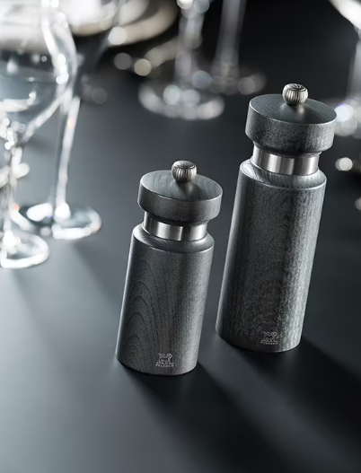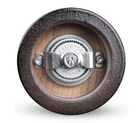 The gorgeous Royan salt mill from Peugeot is made from metallic beechwood and boasts a highly contemporary design with ultimate refinement and sophistication. Its delicate stainless steel ring is strikingly set off by the grain of the mill's body. The salt mill has a high quality grinding mechanism, specially designed to release maximum flavor and aroma by first cracking each sea salt rock before it is ground. You can easily adjust the coarseness of the grind by turning the top nut. The Peugeot pepper mill was made in France, stands 14cm / 5.5 inches tall, and has a lifetime warranty.